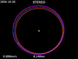 STEREO (Solar TErrestrial RElations Observatory) is a solar observation mission.[2] Two nearly identical spacecraft (STEREO-A, STEREO-B) were launched in 2006 into orbits around the Sun that cause them to respectively pull farther ahead of and fall gradually behind the Earth. This enabled stereoscopic imaging of the Sun and solar phenomena, such as coronal mass ejections.
