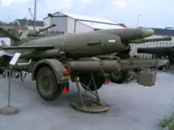 The missile was 5.72 m (18 ft 9 in) long, with a diameter of 0.66 m (2 ft 2 in). Wingspan was 3.01 m (9 ft 11 in) extended and 1.35 m (4 ft 5 in) folded. Height was 1.33 m (4 ft 4 in).[2] The 900 kg (2,000 lb) missile was propelled by a 400 kg (880 lb) Turbomeca Marboré IID jet engine and launched using a pair of rockets mounted on a launch sled, which added another 315 kg (694 lb) to the weight.[3] The rockets released when the missile was airborne, which took about 2 seconds. At takeoff, the missile's speed would be about 500 km/h (310 mph), with a top speed of 900 km/h (560 mph).[4]