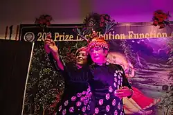 Saang, also known as Swang (meaning "imitation")[1] or Svang, is a popular folk dance–theatre form and a traditional style of storytelling in Haryana, Uttar Pradesh, Rajasthan and the Malwa region of Madhya Pradesh.[2] Swang incorporates suitable theatrics and mimicry (or naqal) accompanied by song and dialogue. It is dialogue-oriented rather than movement-oriented. Religious stories and folk tales are enacted by a group of ten or twelve persons in an open area or an open-air theatre surrounded by the audience. Swang as an art of imitation means Rang-Bharna, Naqal-Karna.