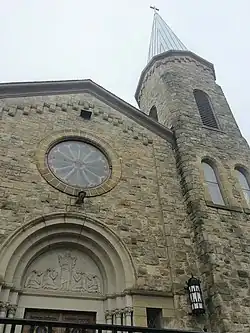 The history of Sacred Heart Church and Catholicism in Sharon, Pennsylvania begins in the early 1850s, when the first Catholic settlers moved to the Shenango Valley area. These first settlers attended services in Mercer, Pennsylvania and Hickory Corners, now located in Hermitage, Pennsylvania. The priests who were in charge of the services at Hickory Corners held the occasional service at the homes of early Catholic families in Sharon. The occasional services continued in this manner until the arrival of Reverend John J. O'Keeffe, who is considered to be the first resident pastor in Sharon.[1] Father O'Keeffe commissioned the building of a pastoral residence, located south of where the current church is. One of the rooms within residence was used as a church until the mid-1860s, when it was decided that a proper church should be built.