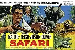 Safari is a 1956 British CinemaScope adventure film directed by Terence Young and set during the Mau Mau Uprising in Kenya. It stars Victor Mature, Janet Leigh, Roland Culver, John Justin, and Earl Cameron, and was intentionally cast to attract an American audience—both the hero and the lead female character are Americans, played by American actors.