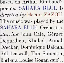 Sahara Blue is a 1992 concept album produced by Hector Zazou.[3] The album commemorated the 100th year of the death of French poet Arthur Rimbaud and included collaborative musical works by John Cale, Khaled, Ryuichi Sakamoto, Tim Simenon, and David Sylvian.[3]