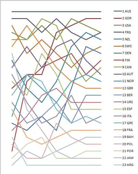 Rank | Country | Helmsman | Crew | Race 1 | Race 2 | Race 3 | Race 4 | Race 5 | Race 6 | Total | Total – discard | ||||||