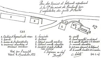 In 1843, Charles Demandre and Joseph Bezanson bought the Ronchamp concession and continued sinking shaft no. 7. They finally found coal at 205 meters, behind the uplift.[1] Shortly after the No. 7 shaft was commissioned, borehole X was drilled on the Champagney plain, uncovering significant coal seams. On August 28, 1845, a prefectoral decree authorized the digging of shaft no. 8.[2]