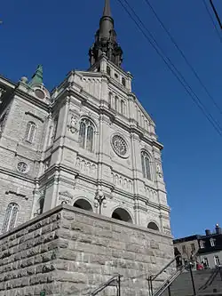 The original structure was completed in 1847, but a disastrous fire that leveled much of the city in 1881 destroyed it completely. The current church was built in 1884 out of seven types of Italian marble. Designed by architect Joseph-Ferdinand Peachy in the Second Empire style, the church was inspired by the facade of the Église de la Sainte-Trinité in Paris. It features a 240 ft (73 m) spire, 36 stained-glass windows, and dozens of statues and paintings, among other ornate decorations. The Gagnon brothers were both organists at the church; Ernest Gagnon from 1853 to 1864 and Gustave Gagnon from 1864 to 1876.[1] The Archdiocese of Quebec closed this church on Pentecost of 2015.[2]