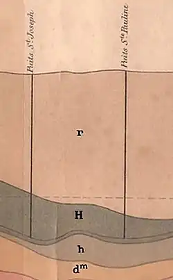 On September 21, a connecting gallery was dug with the Saint-Charles shaft, which provided ventilation.[7] In June 1861, the Saint-Joseph shaft was the most productive in the coalfield, extracting 6,258 tonnes of coal during the month, compared with 2,585 tonnes from the Saint-Charles shaft, 2,622 tonnes from the Sainte-Barbe shaft, and 502 tonnes from the Sainte-Pauline shaft.[15] Production totaled 75,774.7 tonnes in 1861, 67,567.1 tonnes in 1862, and 34,460.8 tonnes in 1863.[16]