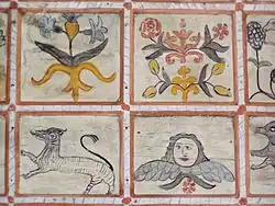 In 1902, Adolphe de Rochemonteix called for the preservation of a work that was both rudimentary and unique in the département:[25] in fact, it is essentially to its ceiling that Saint-Léger church owes its listing as a historic monument in 1927, followed by its classification on February 11, 1963.[45][48] The 1,360 caissons still visible – 560 in the central nave and 400 in each of the side aisles[24] – date from well after the building's construction, but fit in all the better for having been frescoed in colors in harmony with the stone: little green, but blue, black and the whole palette of ochres. While Pierre Moulier doesn't dwell on these naïve representations, which he deems strictly decorative,[17] Pascale Built-Werner, a specialist in late 15th-century paintings,[nb 11]brings them closer to medieval imagery:[50] sometimes borrowing from heraldic art, the motifs seem to her to have been inspired by medieval sculptures and illuminations, and almost all are imbued with Christian symbolism.[51]