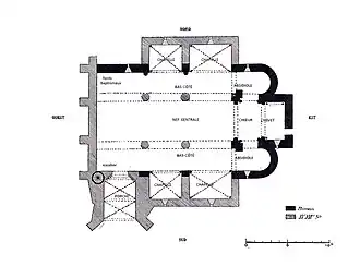 - ^ Plan drawn up by Adolphe de Rochemonteix in 1902. It does not include the 19th-century additions: the rounded sacristy behind the chevet and the two square interior "towers" (the staircase cut into the wall is no longer in use).[39]