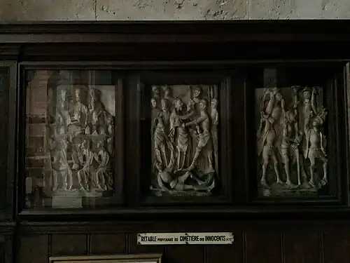 The disambulatory of the church displays an unusual art treasure; a retable with three bas-reliefs made of alabaster, depicting scenes from the life of Christ. They were created in Nottingham, England and date to the 15th century. They illustrate "The Last Supper", "The Kiss of Judas", 'and 'The Flagellation of Christ". They are made in a small format, designed for display in private oratories and in the altar pieces and retables of churches. According to tradition, these sculptures were originally located in Holy Innocents' Cemetery in Paris, the largest cemetery in Paris until the end of the 18th century.[14]