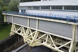 Several projects resulting from an international contest[3] had been successively studied and rejected, because some of the systems that were presented, in particular those of longitudinal type - such as the Ronquières in Belgium (1967) – were badly suited to the Vosgean site. The transverse system was the one best adapted to the topography of the site and also enabled the section of the old canal to be kept in service, limiting considerable cuts in navigation time. The only work of this type existing at the time was the Foxton inclined plane of Foxton, Leicestershire (1900).