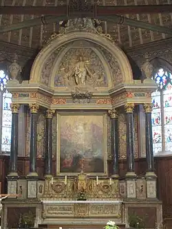 During the restoration of the church in the 19th century, the ceiling was repainted.[23] Like many Normandy churches, it is composed of painted paneling covering an inverted hull frame made up of four sections at different angles.[12]