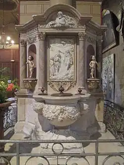 Above the basin lies an altarpiece divided into three panels.[31] The baptism of Christ is depicted in the center.[24] Beneath a sort of pediment, a bust of God the Father dominates the scene. Two statuettes of cherubs frame this central scene, despite the fact that the originals were stolen in the 1970s.[24][32] The sides of the altarpiece are separated by Corinthian columns.[18]