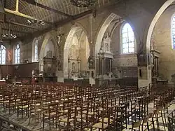 The nave is 14 metres (46 ft) wide and lit by narrow, spaced windows.[11] It is topped by an inverted ship-shaped roof with parquet flooring.[12] The north-side chapels are integrated into the nave, while those on the south side are covered by a small roof, with an octagonal gable following the gradient of the nave roof.[13]