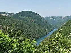 The Lac de Pinet completes the hydrographic network. It is related to a very wild lake on its part downstream, of a maximum depth of 25 meters and a superficial one of 130 ha. It is open to fishing at the upstream part up to Mas de Lanauq. It is in the territories and communes of Saint-Rome-de-Tarn, Saint-Victor-et-Melvieu, and Viala-du-Tarn.[5]