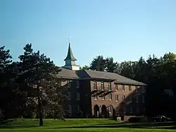The present main abbey building was completed in 1955 to designs by Manchester architects Koehler & Isaak in the Colonial Revival style.[5] The same architects added the adjacent abbey church in 1965 and designed much of the college campus.[6]