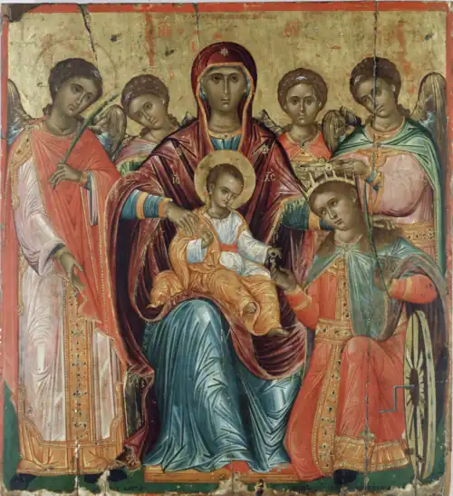 The materials used were egg tempera paint on gold leaf and wood panel. The height is 86 cm (33.8 in), and the width: 78 cm (30.7 in). The work of art was completed sometime between 1550-1608. The work features three main celestial ecclesiastical figures: the Virgin Mary, the Infant Jesus, and a youthful Catherine of Alexandria, surrounded by four angels. Catherine is wearing a princess's crown while she is genuflecting to the infant Christ, accepting her engagement ring. She is also holding a martyr's palm while she is next to a spiked wheel, the symbol of her martyrdom. Two angels hold symbols representing Catherine. One angel holds a martyr's palm, while another crowns her as Jesus' queen, symbolizing her mystical and spiritual union with Jesus Christ. The Virgin Mary is featured in her traditional red frock with the symbols ΙC ΧC Ίσως Χριστός (Jesus Christ ) on her garment, while above her head, the symbols ΜΡ ΘΥ Μήτερ θεού (Mother of God) appear. The position of the Madonna and Child is the traditional Our Lady of the Sign or Nikopoios, but the infant Jesus is facing Catherine instead of the viewers. The icon follows the traditional maniera greca and is clearly characterized by a gilded background, flattened space, and striations to suggest folds of fabric. The drapery folds and the position of the figures create a three-dimensional space. Catherine is wearing a cape-like Pellegrina which is draped over her dress, her stole is draped over the vestment. The work features the painter's signature at the bottom.[8][7][9]