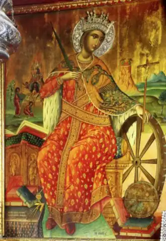 Catherine of Alexandria is a tempera painting created by Ieremias Palladas. Palladas was a monk associated with Saint Catherine's sacred monastery in Egypt also known as Mount Sinai. He was a painter and teacher. His nephew became the Patriarch of Alexandria. His name was Gerasimos Palladas. Ieremias was a Sinaitic monk because of his association with Saint Catherine's monastery on Mount Sinai. The monastery encloses the site where it is assumed by Christians that Moses saw the burning bush.[1][2] Ieremias was one of the most influential figures of his time. The Patriarch of Jerusalem Nectarius wrote about the painter in his archives.[3]