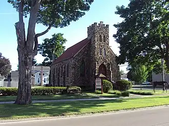 Saint Elizabeth's Church is a small Gothic Revival church located one block east of the Tecumseh Downtown Historic District and across East Chicago Boulevard from the Dr. Samuel Catlin House.[3] It is constructed with a wood frame, over which is a veneer of locally gathered fieldstone. The church has a symmetrical facade with a gable roof and a partly projecting central square tower with crenellated parapet. Two large stained glass windows flank the tower. Five more stained glass windows line each side, separated by simple buttresses. The roof is covered with red clay tile. The interior still contains much of its original craftsman, oak detailing.[4]