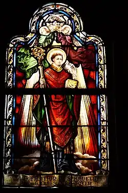 Hadelin is especially venerated in the Walloon diocese of Namur, as founder of the monastery of Celles. He is the patron of Celles, where he is celebrated on the Sunday following the Nativity of the Blessed Virgin (September 8).[2] A silver-made shrine in the Mosan style, can be found in Visé, Belgium.[5][6] Hadalinus is invoked against children's ailments; in iconography his attribute is a dove.