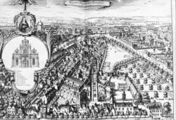 The previous church was a Gothic building with three naves and a transept that was destroyed by Calvinists in 1584 during the Calvinist Republic of Brussels, which lasted from 1577 to 1585.[9][10] The beguines decided to rebuild their church in Baroque style and its construction started in 1657.[6] Attributed to the Flemish architect Lucas Faydherbe,[11] this church is a notable illustration of the Italian-influenced Brabantine Baroque style of the 17th century. Its façade is considered to be one of the most beautiful in Belgium.[6] The church was restored after a fire ravaged the roof in November 2000.[12]