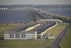 The south-western and western sections of the Ring Road, including the dam facilities and the intersection with the E-20/A-180 route, were gradually constructed throughout the late 2000s. The six-lane causeway across the Gulf of Finland includes bridges, trestles, man-made islands, and a tunnel under the main shipping channel. After more than two decades of construction, the completed Ring Road was officially opened on 12 August 2011 by the Russian Prime Minister, Vladimir Putin, and the Governor of St Petersburg, Valentina Matvienko, who inaugurated the dam facilities.[3] The St. Petersburg Ring Road was notorious for the delays and budget overspending during its construction.[4][5]