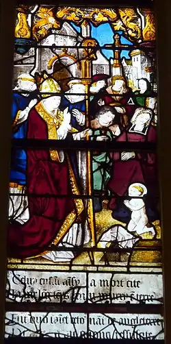 The first story of the lesser known Saint-René began when the Italian Saint Maurilius, the bishop of the French city of Angers (Anjou) in the 5th century, was one day called to assist a moribund child. Unfortunately he was detained by a pressing task in the church, and arrived too late to minister the sacrament of baptism to the child. Feeling responsible for the loss, Maurice decided to expiate it, and left Angers in secret and embarked upon a ship, throwing the keys to the cathedral's treasury into the high seas. He then went further to England, to work as the royal gardener. Meanwhile, the inhabitants of Angers had found the keys inside the liver of a big fish which was caught by the local fishermen. They traced the whereabouts of the bishop to England and convinced him to return to their city. Arriving at Angers, Maurilius prayed at the dead child's tomb, and, in a miracle, the child resuscitated, smiling, "fresh as the flowers growing on the tomb". Because of this Maurilius baptized the boy as Renatus. The tradition is based on a late life of St. Maurilius written in 905 by the deacon Archinald, and circulated under the name of Gregory of Tours, and it seems to have no real foundation.[2]