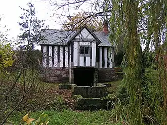 Another well named after St. Winifred is found in the hamlet of Woolston near Oswestry in Shropshire. According to legend, it is thought that on her way to Shrewsbury Abbey, Winifred's body was laid there overnight and a spring sprang up out of the ground. The well is covered by a 15th-century half-timbered cottage. The water flows through a series of stone troughs and into a large pond, which then flows into a stream. The cottage is maintained by the Landmark Trust.[18]