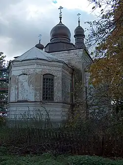 In 1890, due to the poor technical condition of the Intercession of the Theotokos Church and the poverty of its furnishings, it was decided to restore the building and move it to the parish cemetery. A new sacred building, dedicated to Saints Peter and Paul, was to take on the functions of the parish church.[3] The construction of the new church was financed from a state fund designated for the construction of new churches. When the 16th-century church was moved to the cemetery, the following historic items were in the church: a bell from 1544, an eight-armed priest's cross, a smaller cross, and a fragment of royal doors.[3] The wooden cemetery church survived until the early 21st century in a ruined state.[2]