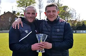 In May 2012, the club appointed Darren Sheridan as the new manager.[78] The 2012–13 league season started well, and the club also enjoyed a local derby in the preliminary round of the FA Cup against FC United of Manchester.[79] Over 1,300 fans were in attendance at Moor Lane to watch a narrow loss in a five-goal thriller.[80] Sheridan's tenure lasted only eight months, resigning in January 2013 following a review of the club's budget, with his final game being a 5–2 win against Wakefield despite being down to 8 players.[81][82] Salford appointed Andy Heald as caretaker manager,[83] before announcing his permanent appointment a month later.[84] Before his first game, club captain Jimmy Holden departed, defender Jameel Ibe left for York City, and striker Danny Heffernan returned to Australia; Heald managed the team to a 2–2 draw with Mossley.[85] Under his leadership, Salford finished a disappointing 16th place, which included a 6–0 battering by Trafford,[86] but enjoyed a run to the final of the Manchester Premier Cup where they faced Mossley at Edgeley Park; despite a rousing late comeback to level the game at 2–2, Salford lost 4–2 in the resulting penalty shoot-out.[87] At the end of the season, Heald and his assistant Chris Thompson left the club by mutual consent, citing business and family commitments.[88]
