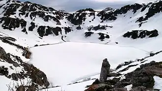 Saliencia Lakes are a conjoined group of post-glacial lakes in Somiedo, Asturias, Spain. They are situated in the Somiedo Natural Park and are composed of the following: Calabazosa (or Black Lake), Cerveriz, Almagrera Lagoon (or La Mina), and Lago de la Cueva. Lago del Valle, at 5,085 feet (1,550 m) above sea level, is the largest in the group and is the principality's largest lake.[1] Fauna in the lake valley includes the presence of Eurasian brown bear, Otter, Egyptian vulture and Golden eagle. The majority of amphibians inside the park are found by these lakes, including Alpine newt, Palmate newt, Fire salamander, common toad, Common midwife toad, Common frog, and the Iberian frog. The lakes are protected space within the World Network of Biosphere Reserves of Somiedo Natural Park, declared a natural monument on 22 May 2003. Myth has it that the lakes are guarded by xanas (fairy princesses).[2]