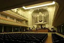The hall opened its doors on 3 October 1907 for the concert of the Lehrergesangverein (Teachers' Choir of the city of Bremen with one hundred and forty performers). It immediately became a prestigious hall. Camille Saint-Saëns' concert in the Salle Gaveau [audience and orchestra from the stage];[4] then other famous musicians gave concerts there from the first months after the opening. The concerts Lamoureux, conducted by Camille Chevillard, Vincent d'Indy and André Messager, moved to Gaveau. On 5, 8 and 12 November 1907, Alfred Cortot, Jacques Thibaud and Pablo Casals performed the complete trios by Beethoven. In the following years, the Salle Gaveau hosted Eugène Ysaÿe (21 January 1908), Lazare-Lévy (27 January 1909), Marguerite Long[5] (11 December 1911), Georges Enesco (8 February 1912), Fritz Kreisler (21 and 28 April 1912), Wilhelm Backhaus (15 May 1912), Claude Debussy (5 May 1917).[6]