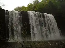 The Salmon River Falls is a 110-foot (34 m) waterfall in Oswego County, located approximately 15 miles inland from the river's confluence with Lake Ontario and between the Salmon River's two reservoirs. It is situated within the 112-acre (0.45 km2) Salmon River Falls Unique Area, managed by the New York State Department of Environmental Conservation. The falls and surrounding land was owned by the Niagara Mohawk power company prior to 1993, when ownership was transferred to New York State. The area has since been improved with parking areas, wheelchair-accessible trails, and interpretive kiosks, and is a popular sightseeing destination in the region. Historically, the falls were the natural upstream limit for spawning salmon in the river prior to the construction of the Lighthouse Hill Dam.[12]