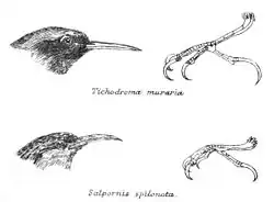 Salpornis is a genus of birds which was usually included in the family Certhiidae, but recently elevated to its own family Salpornithidae.[2] The genus has in the past also been included with the nuthatches in the family Sittidae. Molecular phylogenetic analyses show them to be definitely within the Certhioidea but still leaves some uncertainty about their placement in relation to the genera Sitta, Tichodroma and Certhia. While they appear similar to the treecreepers (Certhia), they do not use their tails to support them while climbing and some molecular evidence shows them to be closer to the nuthatches (Sitta)[3] while another study suggests a closer relation to the wallcreeper Tichodroma muraria.[4] The generic name is derived from the Greek salpinktes for wren and ornis for bird.[5]
