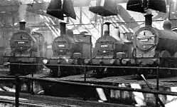Saltley station was the site of a large roundhouse motive power depot established by the Midland Railway in 1868. This was doubled in size in 1876, by the addition of a second roundhouse, and a third was added in 1900.[4] The depot was re-roofed by British Railways in 1951, but closed on 6 March 1967 and was later demolished. The shed yard was used for stabling diesel locomotives until at least 1999.[4] Under the London Midland and Scottish Railway and British Railways Saltley had the shed code 21A. As a diesel stabling depot it was SY.
