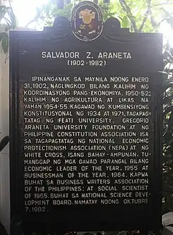 Salvador Araneta y Zaragoza (January 31, 1902 โ October 7, 1982)[1] was a Filipino nationalist, constitutionalist, politician, civil servant, lawyer, educator, economist, businessman, industrialist, environmentalist, and philanthropist.