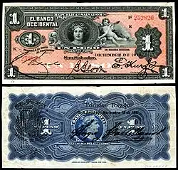 The government issued banknotes (engraved and printed by the National Bank Note Company of New York) denominated in pesos in 1877, in denominations of 1, 2, 5, 10, 25, 50, 100 and 500 pesos.[3] Following this, private banks issued notes until after the peso was replaced by the colón. These included the Banco Agricola Comercial, the Banco de Ahuachapam, the Banco de Centro America y Londres, the Banco Industrial del Salvador, the Banco Internacional del Salvador, the Banco Nacional del Salvador, the Banco Occidental and the Banco Salvadoreño. Notes were issued in denominations of 1, 2, 5, 10, 25, 50, 100 and 500 pesos.