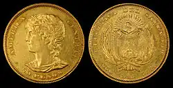 The first decimal Salvadoran coins were issued in 1889. These were copper-nickel 1 and 3 centavos.[1] On August 28, 1892, the Salvadoran mint was established and production of silver and gold coins denominated in centavos and pesos began. In addition to copper 1 centavo coins, there were silver 5, 10, 20 centavos and 1 peso, and gold 2+1⁄2, 5, 10 and 20 pesos,[2] although the gold coins were only issued in very small numbers (597, 558, 321, and 300 respectively).[2] In 1909, bronze 1⁄4 real coins were issued in response to the continued use of the real currency system in parts of the country. Coins for 25 centavos were introduced in 1911. Production of silver coins was suspended in 1914.