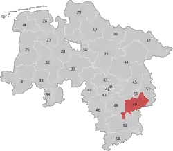 Salzgitter – Wolfenbüttel is located in southeastern Lower Saxony. As of the 2021 federal election, it comprises the independent city of Salzgitter, the entirety of the district of Wolfenbüttel, and the Samtgemeinde of Lutter am Barenberge and municipalities of Langelsheim, Liebenburg, and Seesen from the district of Goslar.[1]