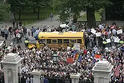 Other cities and towns in Massachusetts began issuing applications during normal business hours. Boston Mayor Thomas Menino greeted three of the couples who were plaintiffs in Goodridge and said: "We've broken down the barrier. I am so proud of these people. I am very proud to be mayor of this city today."[91] The first to marry in Boston City Hall were Tom Weikle and Joe Rogers, who lined up for their license application at 5:30 a.m. and were wed about 11 a.m. by Boston's city clerk.[87] Rejecting the Romney's insistence that the 1913 statute be respected, Somerville Mayor Joseph Curtatone addressed a crowd of same-sex couples that included several from New York gathered in front of Town Hall at 8 am.: "No matter who you are or where you come from, if you fill out the application, you will be given a license to marry. Those of you from out of state, welcome to Somerville."[87] The seven couples who were party to the Goodridge lawsuit were all wed on May 17,[92] beginning with Robert Compton and David Wilson at Boston's Arlington Street Church.[91] There were sizable celebrations in Northampton, Worcester, and Provincetown, while "explicit protests were scattered and few".[93]