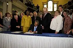 The Massachusetts General Court took up the repeal of the 1913 law the next month. On July 15, the Massachusetts Senate voted to repeal it on a unanimous voice vote.[142][143] The House approved the legislation on July 29, 2008 on a 118 to 35 vote,[144][145] and Governor Deval Patrick signed the bill into law on July 31. It took effect immediately.[146][147] Patrick said: "I think other states will make their own judgments, and I expect them to–that's their own business. All we can do is tend our own garden, and make sure that it's weeded, and I think we've weeded out a discriminatory law that we should have."[148] MassResistance mounted a petition drive for a referendum to reinstate the law in October 2008, but failed to collect enough signatures.[149]