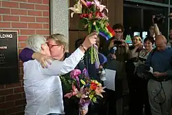 Minutes after the decision was announced at noon, officials in at least four counties were fulfilling requests for marriage licenses from same-sex couples. The first to wed in Multnomah County were two of the plaintiffs, Deanna Geiger and Janine Nelson.[46] That county issued 96 licenses the first day, and judges officiated at wedding ceremonies in a Portland ballroom.[47][48][49] Governor John Kitzhaber, the named defendant, said "I strongly support Judge McShane's decision to overturn institutional discrimination in Oregon's constitution. No longer will Oregonians tolerate discrimination against the gay, lesbian, and transgender community. [...] Now, finally, all Oregonians will have the opportunity to make a legal commitment to the person they love. Every person and every family in Oregon deserves that chance. Today is a win for love, for families, and for freedom." Senator Jeff Merkley called it "a historic day for Oregon", and Senator Ron Wyden said, "Judge Michael McShane's decision marks a significant moment in Oregon's civil rights history, and it's an important step toward equal rights for all Americans. Every American deserves the freedom to marry the person they love, and, starting today, all Oregonians will have that choice. I am proud to have stood with Oregon's same-sex couples in this struggle for marriage equality for nearly 20 years, and it's important to keep pushing until that right extends to all Americans." The Republican House Minority Leader, Mike McLane, issued a statement, "For those that believe marriage is a religious covenant, the origin of which predates America, today's federal court ruling won't change that. For those that believe marriage is a legal union between two people that is recognized and enforced by our state government, today's ruling is a logical extension of the Supreme Court's ruling last summer. Our society must embrace both views. My hope is that the process of reconciliation in Oregon will continue as we move forward with respect for each other." Val Hoyle, the Majority Leader of the House, said "I married the person who I love over 22 years ago, and I'm thrilled that all Oregonians now have the freedom to do the same."[50]
