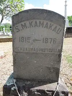 From 1866 to 1871, Kamakau wrote a series of newspaper articles about Hawaiian culture and history: "Ka Moʻolelo o Kamehameha I", a history of Kamehameha I; "Ka Moʻolelo o Nā Kamehameha", a history of the House of Kamehameha; and "Ka Moʻolelo Hawaiʻi", a history of Hawaiʻi. The articles were published in the Hawaiian language newspapers, Ke Au ʻOkoʻa and Ka Nūpepa Kūʻokoʻa. Kamakau has served as a district judge in Wailuku, Maui and was a legislator for the Hawaiian Kingdom.[1] From 1851 to 1860 he represented Maui in the House of Representatives, and from 1870 to 1876 represented Oʻahu.[7] He died at his home in Honolulu on September 5, 1876, and was buried in the Maʻemaʻe Chapel Cemetery in Nuʻuanu Valley.[8]