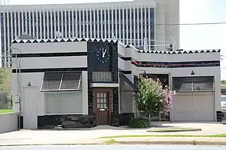 The Samuel P. Taylor Service Station is a historic commercial building at 1123 West 3rd Street in Little Rock, Arkansas. Built in 1938, it is an excellent example of a period automotive filling station with Art Deco styling. It is a single-story L-shaped structure, with three service bays set at different angles, and an office in front. A zigzag pattern of black tiles extends across the building's cornice, and black tile is used prominently around the main entrance and below the office windows.[2]