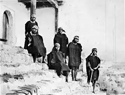 Since they were staying at the town school, they could see a class: little boys showed up early, dressed exactly like their parents with the difference that the red handkerchief on their heads looked older and seemed to have been passed from fathers to sons; the kids put literally their faces in their books, too shy to see the visitors until the teacher came and took roll call.[9] After that, the teacher stepped out and the children went back to their book, for the next three hours, as the teacher could not speak their language and they did not know any Spanish.[9] That day there was not class for the girls, who were dismissed because the visitors were staying at their class.[9]