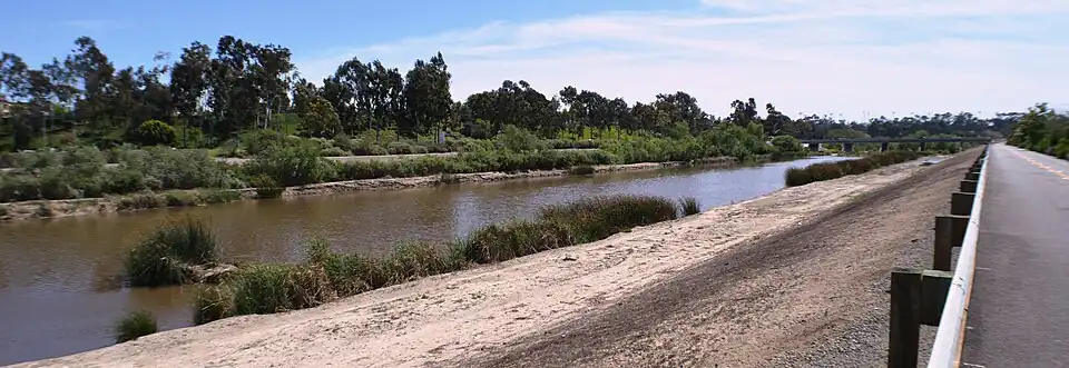 San Diego Creek is a 16-mile (26 km) urban waterway flowing into Upper Newport Bay in Orange County, California, United States.[1] Its watershed covers 112.2 square miles (291 km2) in parts of eight cities, including Irvine, Tustin, and Costa Mesa.[2] From its headwaters in Laguna Woods the creek flows northwest to its confluence with Peters Canyon Wash, where it turns abruptly southwest towards the bay. Most of the creek has been converted to a concrete flood control channel, but it also provides important aquatic and riparian habitat along its course and its tidal estuary.[3]