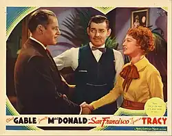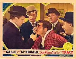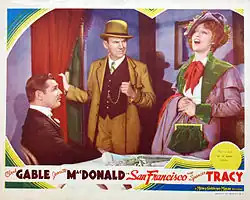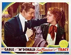San Francisco is a 1936 American musical-drama disaster film directed by W. S. Van Dyke, based on the April 18, 1906 San Francisco earthquake. The film stars Clark Gable, Jeanette MacDonald and Spencer Tracy. MacDonald's singing helped make this film the highest grossing international hit of the year,[1] coming on the heels of her other 1936 blockbuster, Rose Marie.