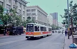 The San Francisco Historic Trolley Festival was a heritage streetcar service along Market Street in downtown San Francisco, California, that used a variety of vintage streetcars and operated five to seven days a week, primarily in the summer months, between 1983 and 1987.[3][4] Operated by the San Francisco Municipal Railway (Muni), the city's primary transit agency, and co-sponsored by the city's Chamber of Commerce and various corporate and private donors, it was the predecessor of the F Market & Wharves streetcar line that opened in 1995.[5] It used historic streetcars/trolleys – these two terms are synonyms in most parts of the United States[6] – from several different countries, as well as a number of preserved San Francisco streetcars, many of which were borrowed from museums. The impetus behind the Trolley Festival was that the city's famous cable car system, one of its biggest tourist attractions, was due to be closed for 20 months (this ended up stretching to 21 months)[7] starting in September 1982 for a needed rebuilding of its aging infrastructure. Local business owners and city officials were very concerned that the temporary absence of the cable cars would lead to a sharp decline in tourism,[8][9] especially during the one summer season included in the 20-month period.