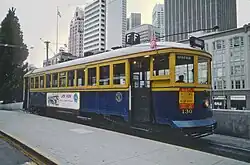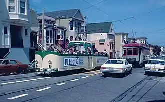 The service began on September 11 and concluded on October 17.[83][86] It operated only on Fridays and Saturdays, from 10 a.m. to 6 p.m., with both cars in service concurrently, on a scheduled headway of 15 minutes.[86] Temporary stops were set up, with the termini being at the Ferry Building (under the elevated Embarcadero Freeway) and across from Pier 39, with one intermediate stop at Levi's Plaza.[87] Earlier in the year, before the idea had been fully approved, Muni briefly ran a similar operation using car 578 from April 15–19 between Pier 39 and Pier 27 only, in connection with a railfan event known as "Railfair".[88]