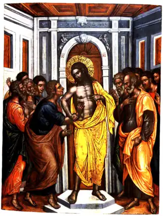 Between 1560–1583, Michael Damaskinos completed works for the church. Twenty-five of his major works are located in Venice. Twenty of his paintings are part of San Giorgio dei Greci. Eighteen of his icons are part of the iconostasis of the church. One of them portrays the Archangel Michael. Nine of the paintings exhibit the dodekaorto known as the Great feasts in the Eastern Orthodox Church. Two of his works are behind the iconostasis within the holy sanctuary. Four of his works are part of the Hellenic Institute of Venice. The museum and research facility is associated with San Giorgio dei Greci. One of his paintings Wedding at Cana is located at the Museo Correr in Venice.[4]