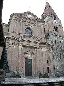 A church at the site was present since the 11th century, allied to the Abbey of San Michele della Chiusa. The present building derives from a reconstruction started after 1755 under the designs of Vittone. The stout brick and stone bell-tower is the only remnant from the prior Romanesque structures.